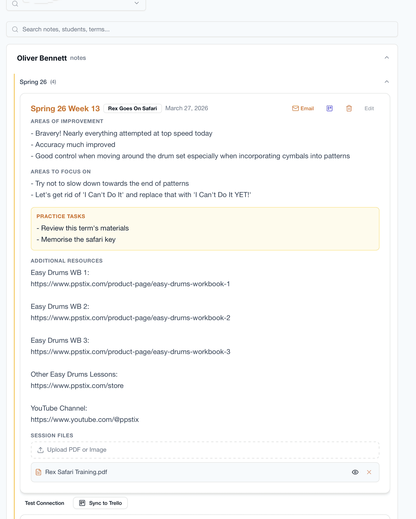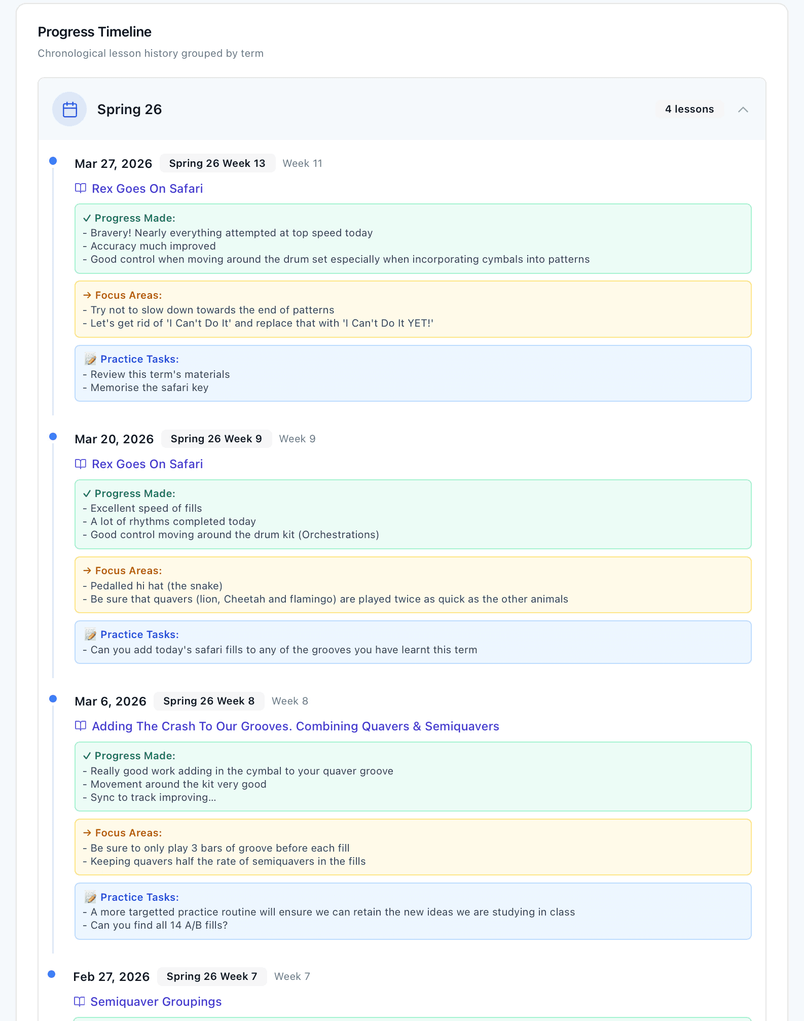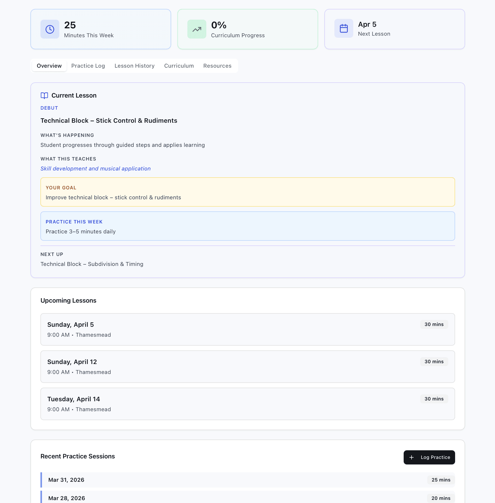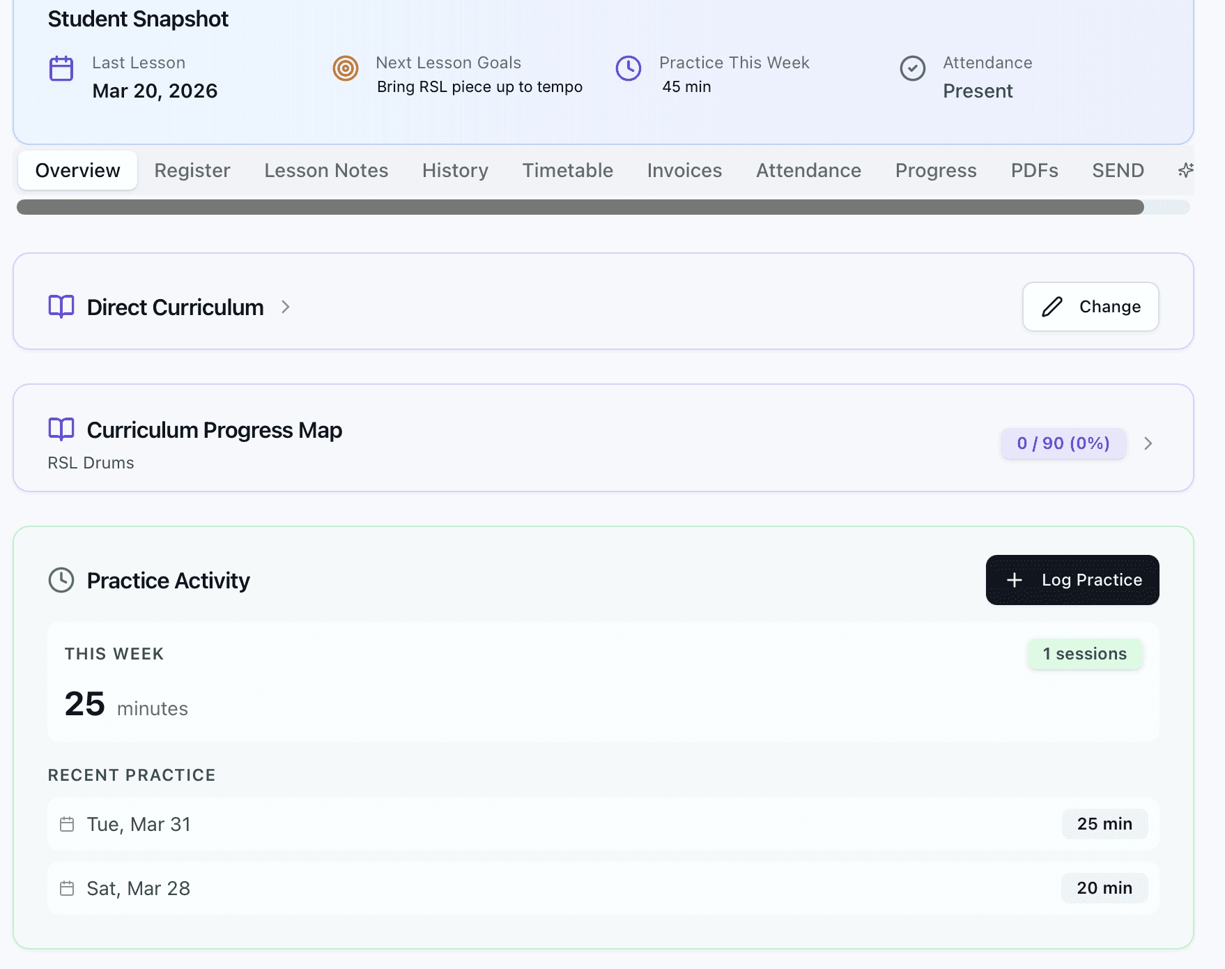 Track lesson notes, manage student progress, automate invoices, follow up with reminders, coordinate schools, and much more—built specifically for music teaching.