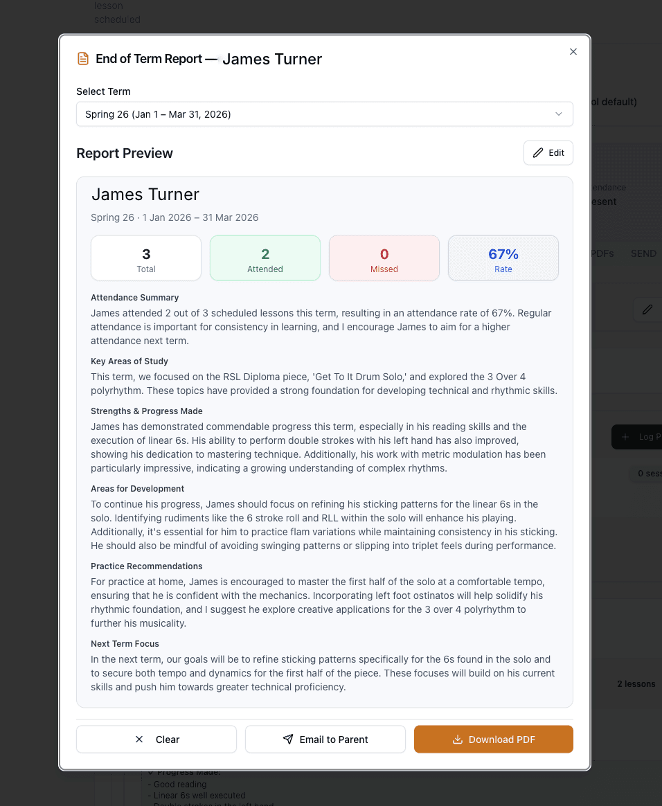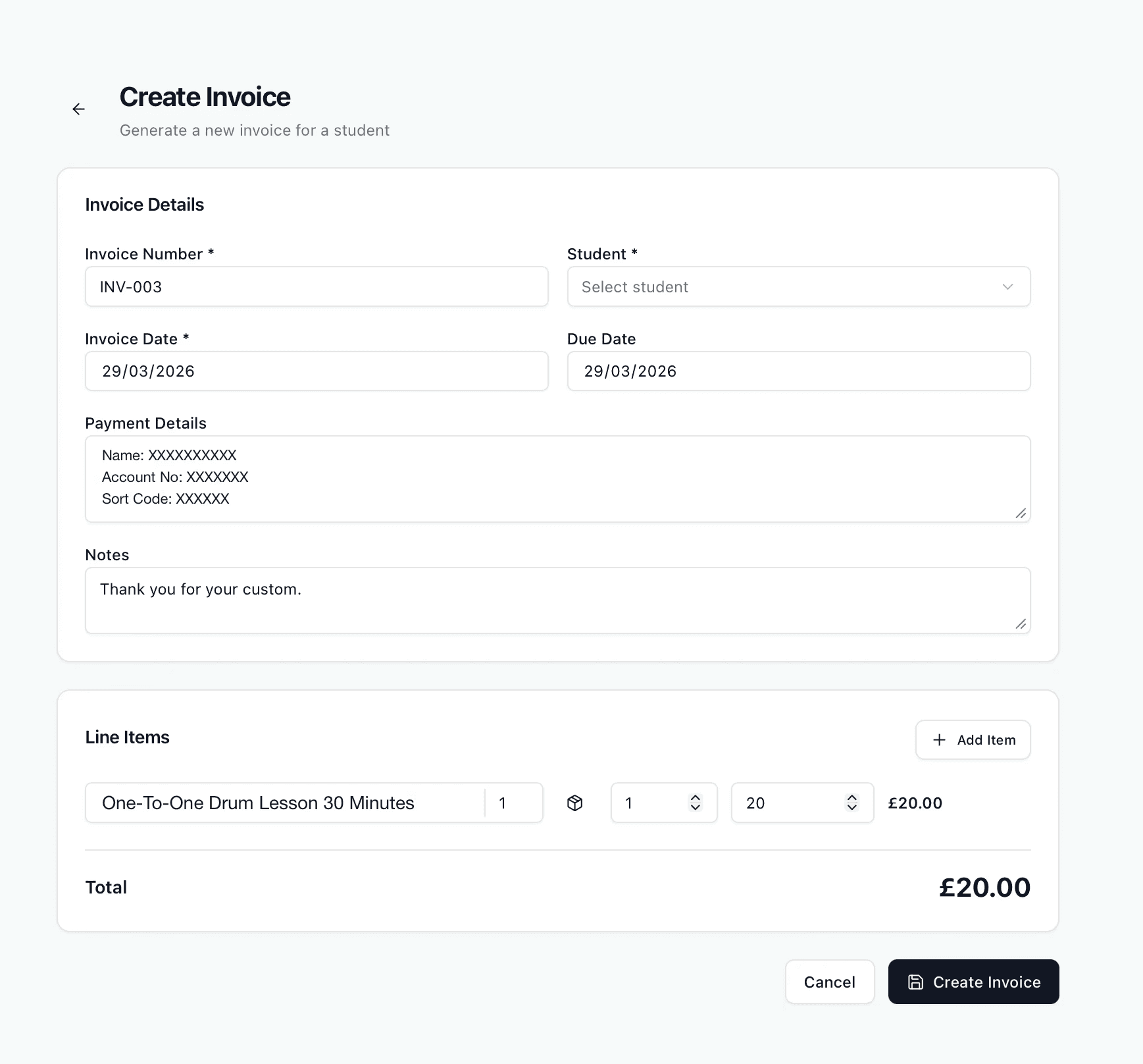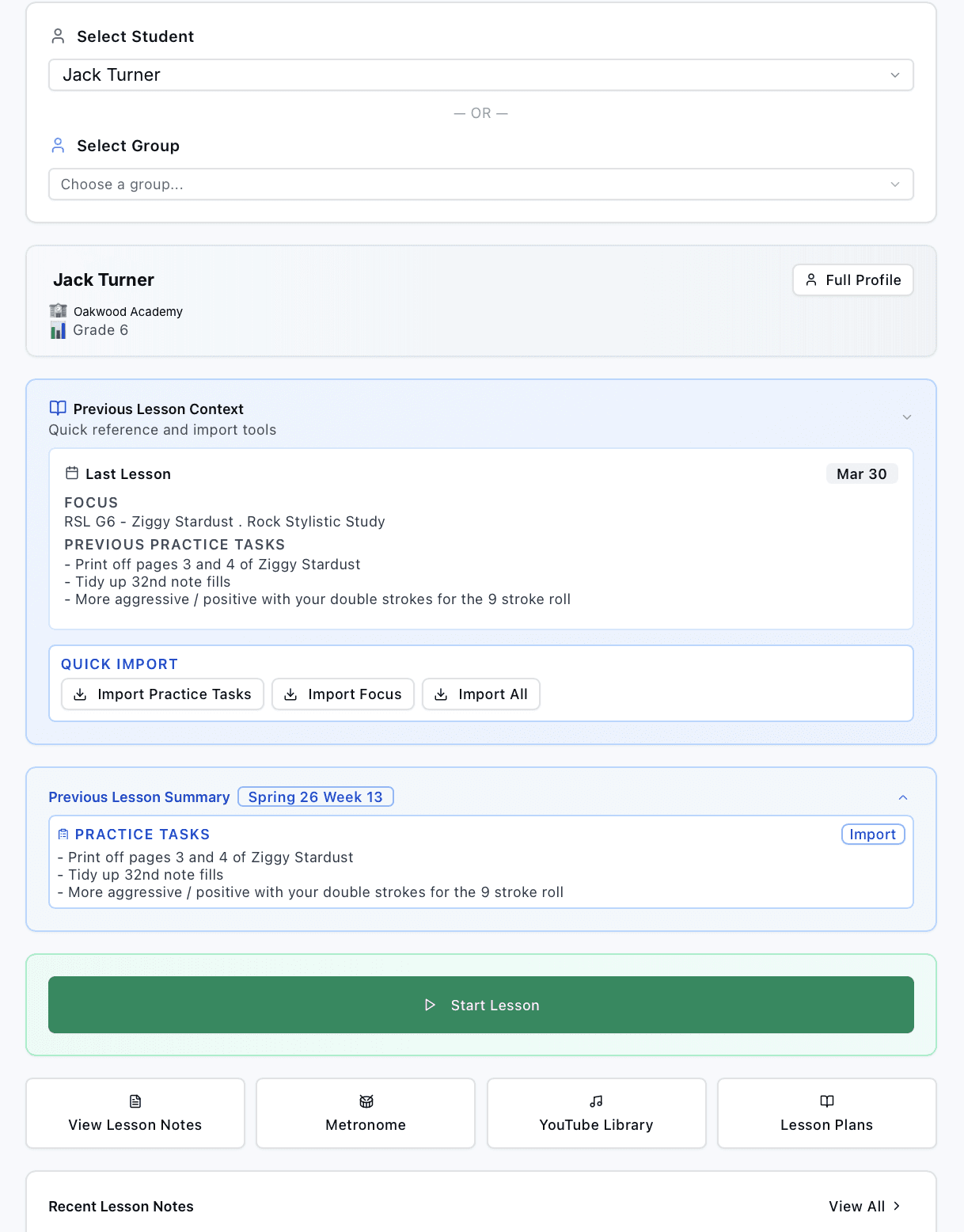 Track lesson notes, manage student progress, automate invoices, follow up with reminders, coordinate schools, and much more—built specifically for music teaching.