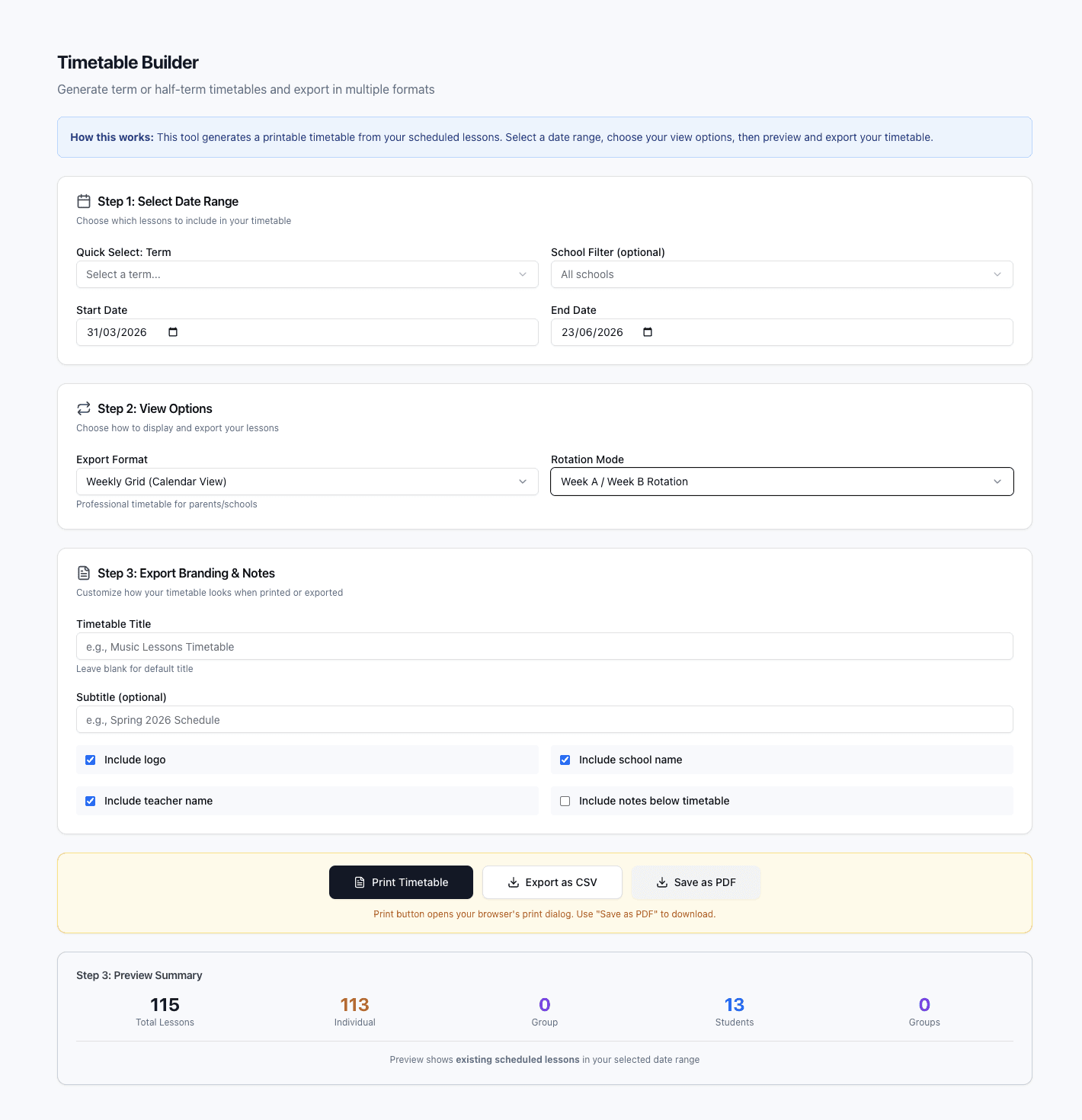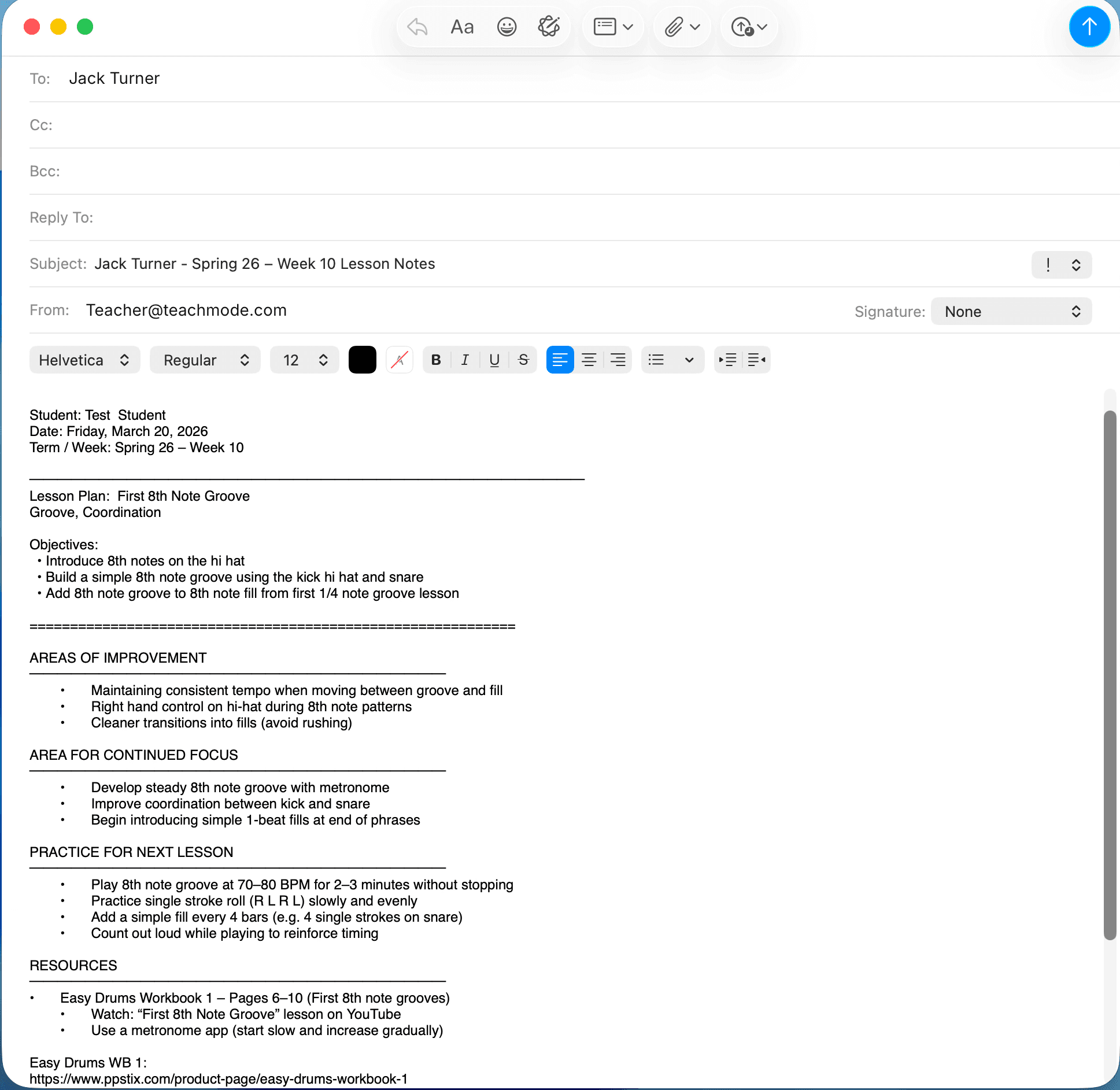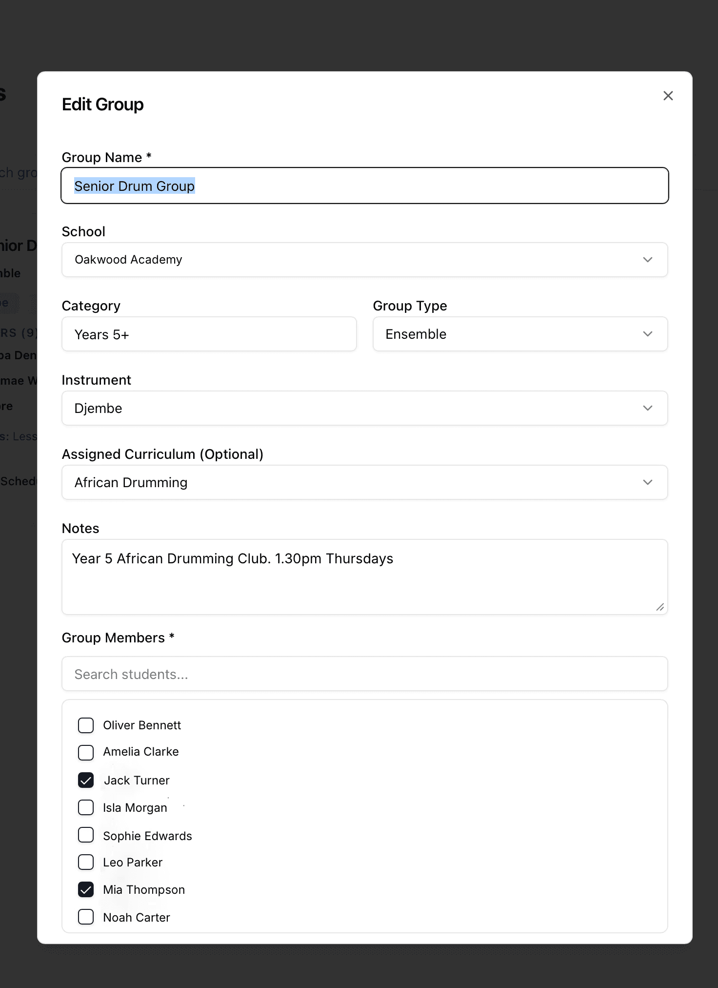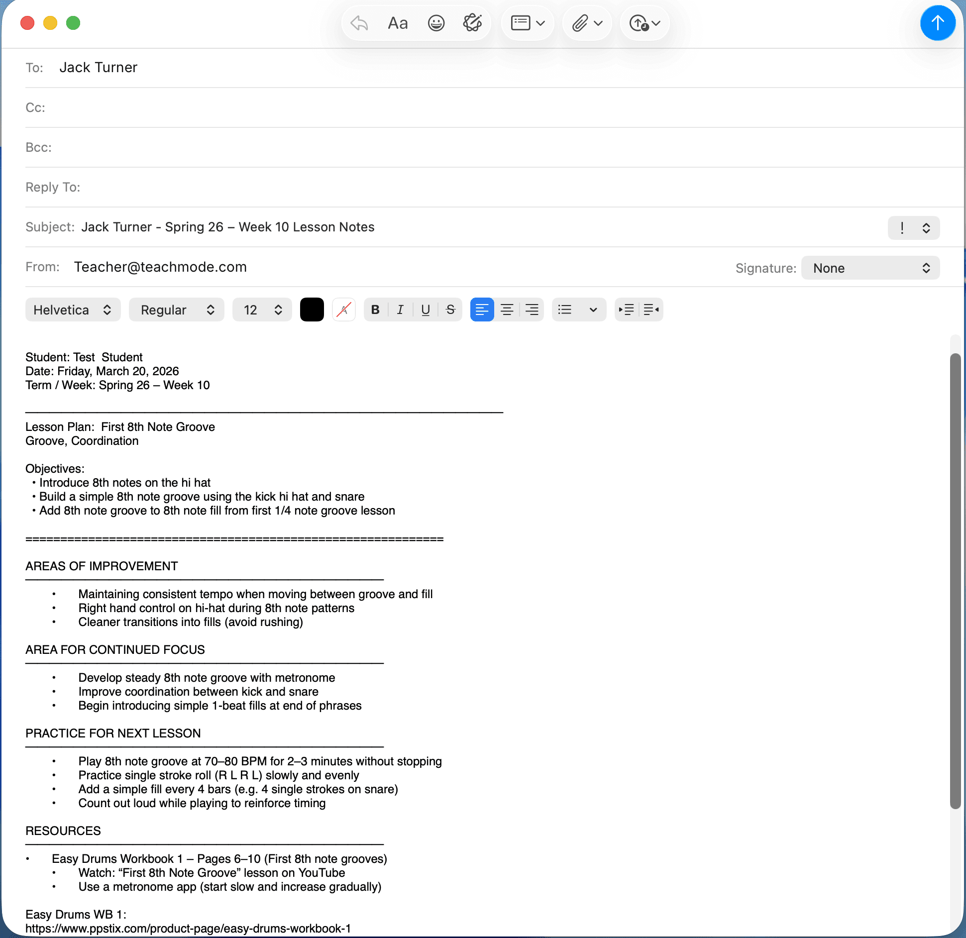 Track lesson notes, manage student progress, automate invoices, follow up with reminders, coordinate schools, and much more—built specifically for music teaching.