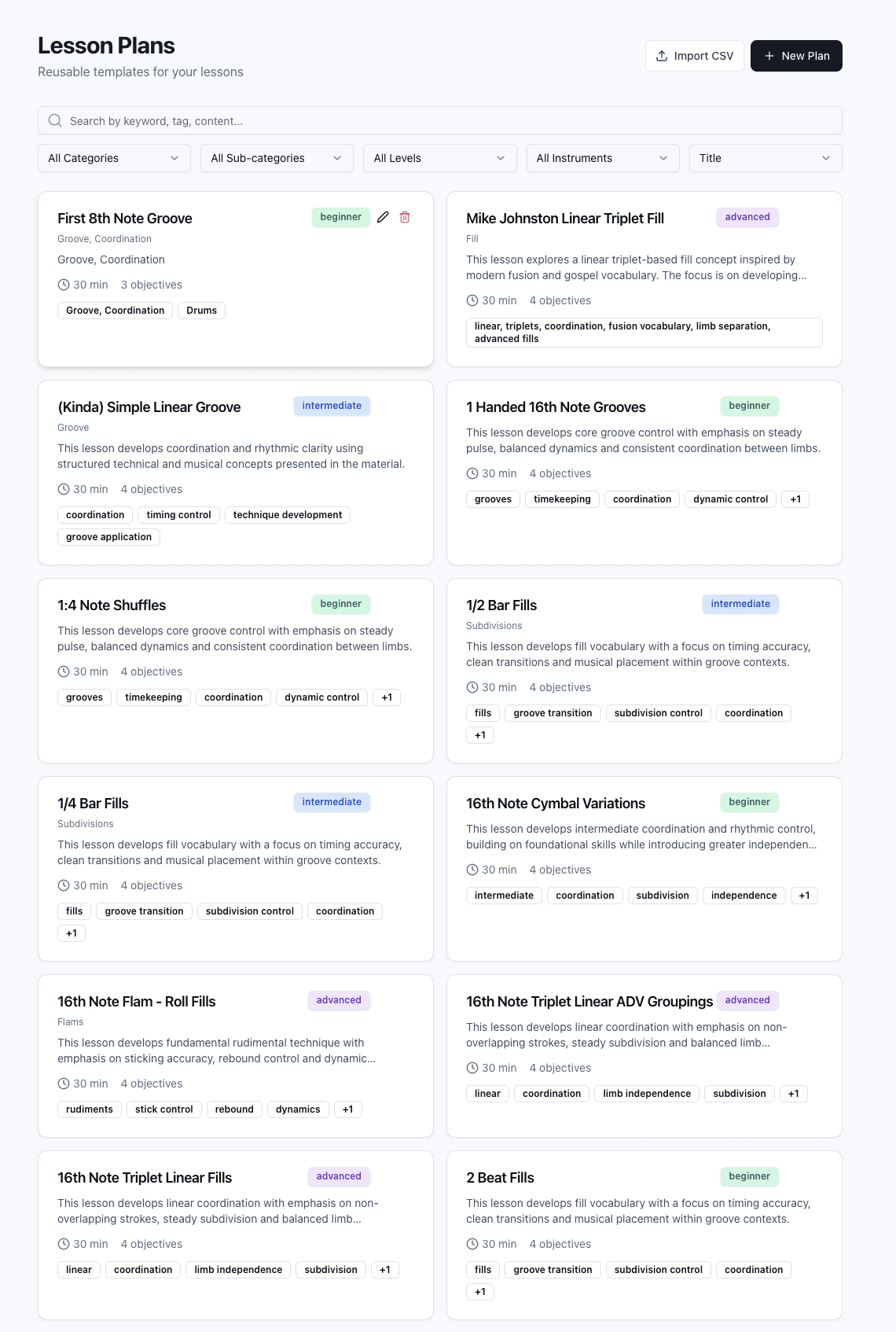 Design lessons in seconds, reuse templates, and stay organised across every student.