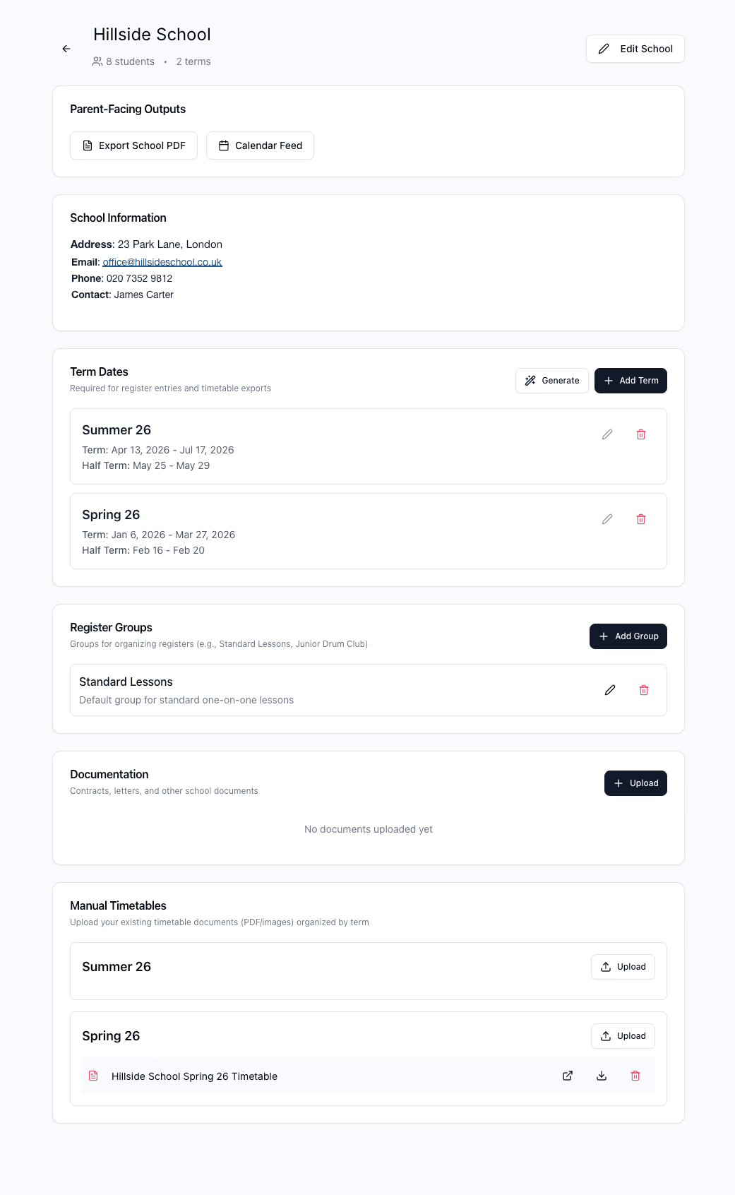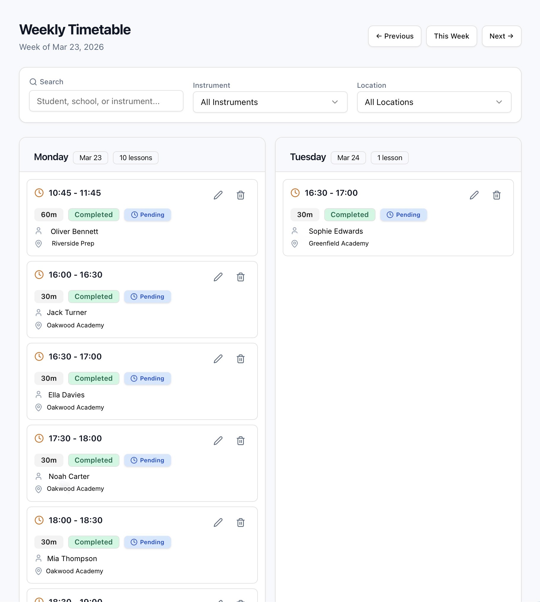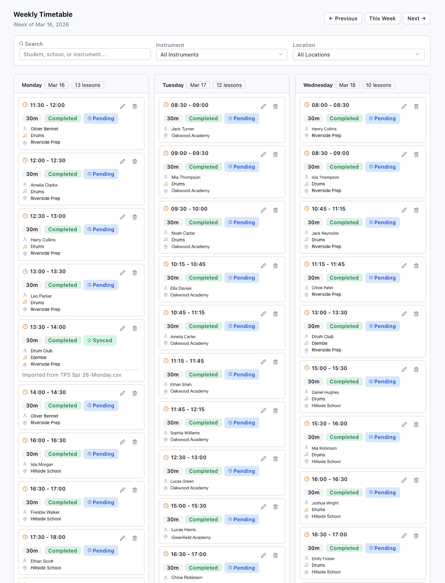 Easily adjust lesson times, swap schools, or change students. Your calendar fits the teaching day.