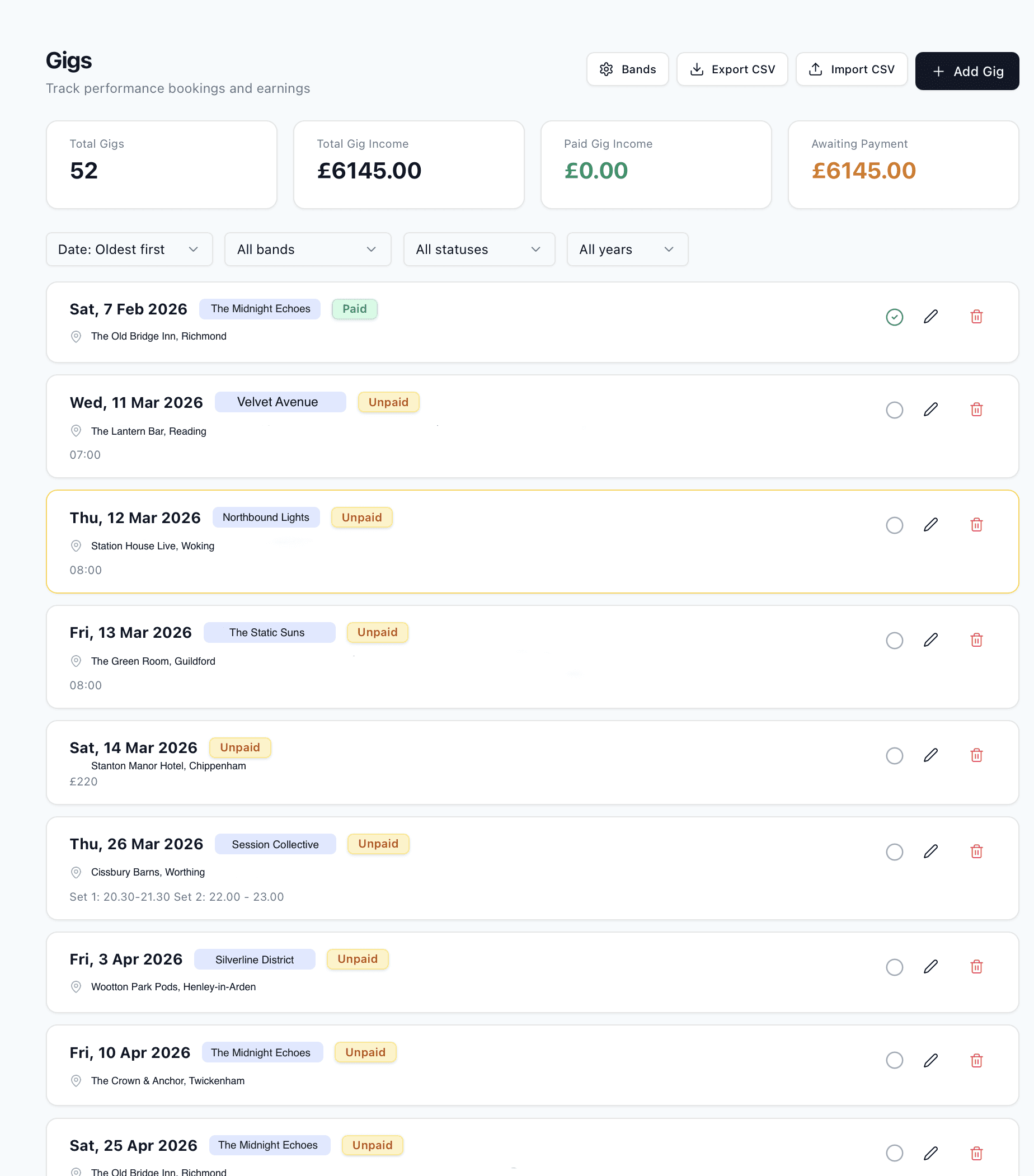 Manage your teaching, performances, and income in one place. No spreadsheets, no switching apps — just one clear workflow.