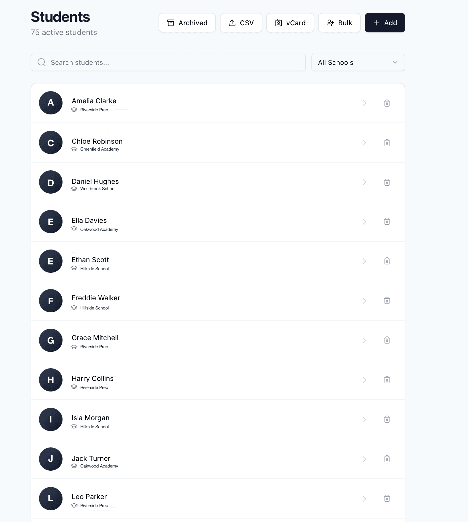 Keep student progress clear with daily notes, parent feedback, and quick access to past lessons.